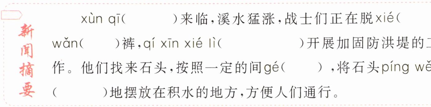 xùn qī( )来临,溪水猛涨,战士们正在脱 xié( )wǎn( )裤,qí xīn xié lì( )开展加固防洪堤的工作。他们找来石头,按照一定的间 gé( ),将石头 píng wěn( )地摆放在积水的地方,方便人们通行。