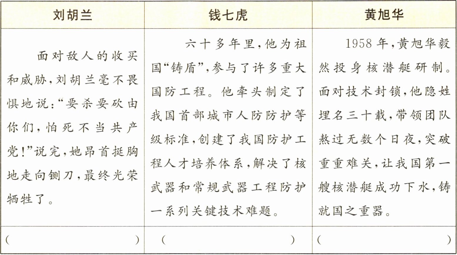 |面对敌人的收买和威胁,刘胡兰毫不畏惧地说:"要杀要砍由你们,怕死不当共产党!"说完,她昂首挺胸地走向铡刀,最终光荣牺牲了。|六十多年里,他为祖国"铸盾",参与了许多重大国防工程。他牵头制定了我国首部城市人防防护等级标准,创建了我国防护工程人才培养体系,解决了核武器和常规武器工程防护一系列关键技术难题。|1958年,黄旭华毅然投身核潜艇研制。面对技术封锁,他隐姓埋名三十载,带领团队熬过无数个日夜,突破重重难关,让我国第一艘核潜艇成功下水,铸就国之重器。|