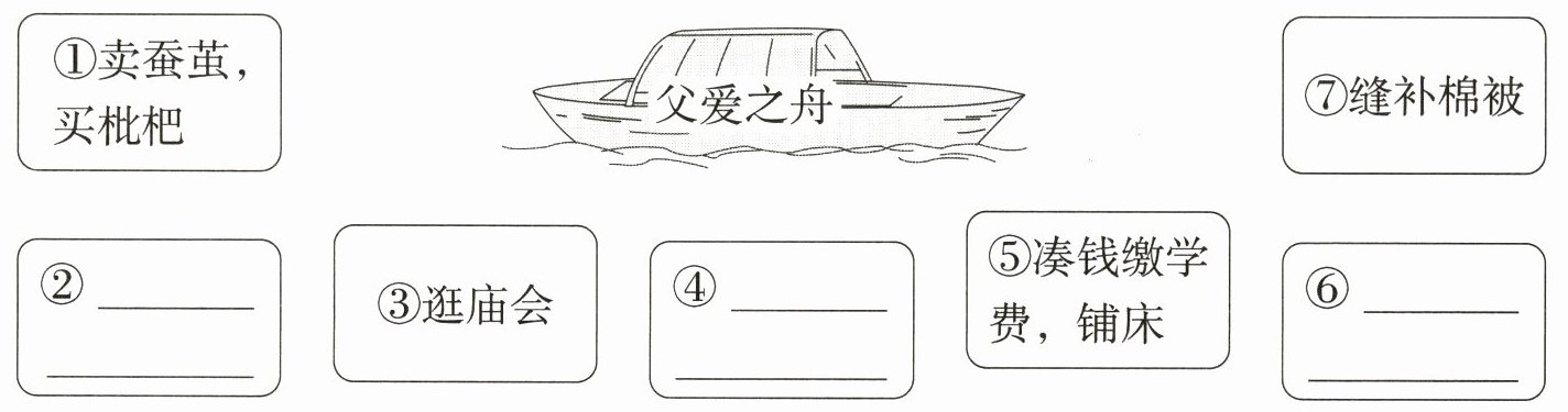 1. 优优根据《父爱之舟》的内容梳理了场景,请帮她补全思维导图并回答问题。(6分)