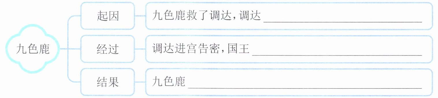 表示感谢并发誓决不会说出九色鹿的住处 调集军队跟随调达去九色鹿的住地 揭穿调达,国王严惩了调达(每空1分) 解析:本题考查对文章内容的概括能力。首先阅读文章,将文章按照起因、经过、结果划分好层次:文章第①—⑤自然段写了九色鹿救了调达,调达表示感谢并发誓决不会泄露九色鹿的住处,交代了事情的起因;第⑥⑦自然段写了调达出卖九色鹿,交代了事情的经过;第⑧⑨自然段写了九色鹿揭穿了调达的真面目,国王严惩调达,交代了事情的结果。接着用简洁的语言概括出每部分的主要内容即可。