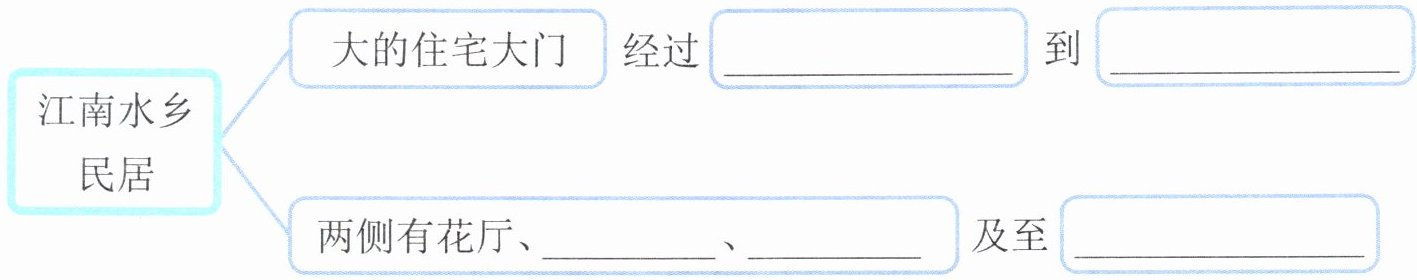 1. 思维导图 江南水乡的民居独具特色,请你根据文章的介绍将下面的思维导图补充完整,感受江南水乡民居的韵味。(5 分)