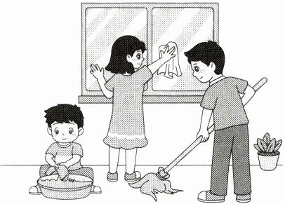 2. 仿照例句,至少用上三个动词,记录一家人劳动的美好瞬间。