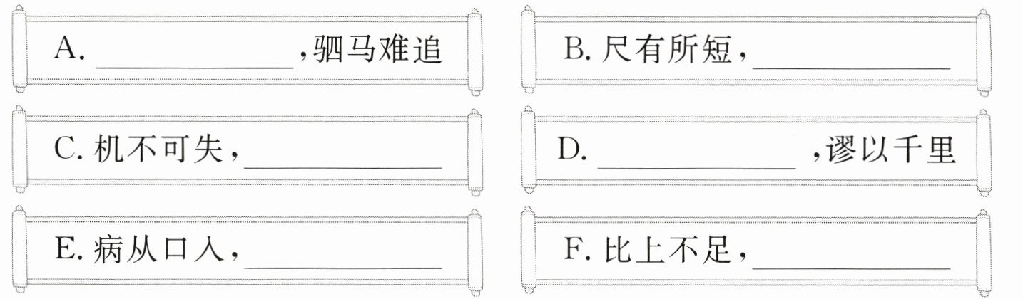 A.一言既出 B.寸有所长 C.时不再来 D.差之毫厘 E.祸从口出 F.比下有余 1.E 2.B 3.D