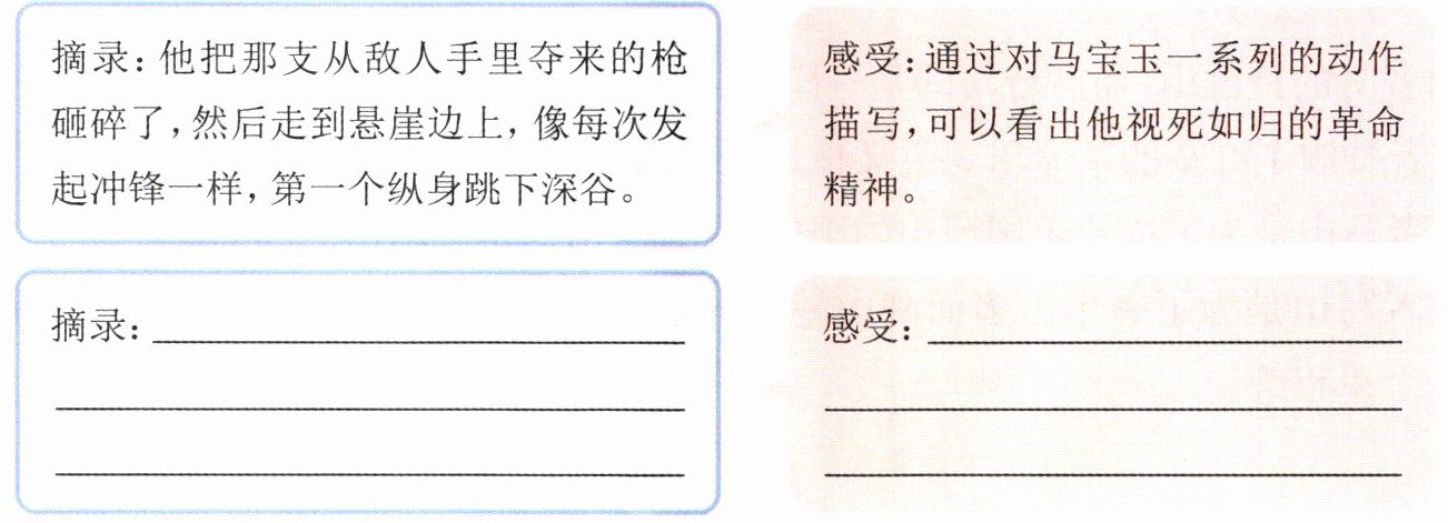 | 摘录:他把那支从敌人手里夺来的枪砸碎了,然后走到悬崖边上,像每次发起冲锋一样,第一个纵身跳下深谷。 | 感受:通过对马宝玉一系列的动作描写,可以看出他视死如归的革命精神。 |