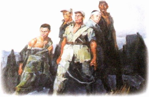 五位壮士屹立在狼牙山顶峰,眺望着群众和部队主力远去的方向。他们回头望望还在向上爬的敌人,脸上露出胜利的喜悦。班长马宝玉激动地说:“同志们,我们的任务胜利完成了!”说罢,他把那支从敌人手里夺来的枪砸碎了,然后走到悬崖边上,像每次发起冲锋一样,第一个纵身跳下深谷。战士们也昂首挺胸,相继从悬崖往下跳。狼牙山上响起了他们壮烈豪迈的口号声: