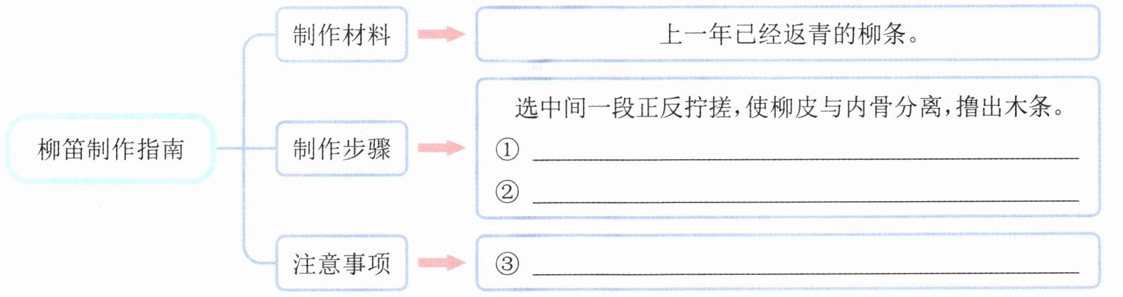 (3) ① 把空心的柳皮截成一段一段的。 ② 切齐两头,将其中一头的外皮刮去半厘米左右。 ③ 选择上一年已经返青的柳条,因为这样的柳条柔软有韧性,不易折断,且音质好;而不选新生出的柳条,因为新柳条树皮太柔软,且皮与木质还不好分离。 2. ③ ④ BCD 3. ④ 一个有关柳笛的故事 起因:学校搞文艺活动评比,班主任别出心裁地成立了柳笛合奏队。 经过:为取得好名次,每天下午放学后,班主任组织‘我们’练习吹奏。 结果:‘我们’的曲目博得台下雷鸣般的掌声和呐喊声。 4. 折纸船 首先准备好两张长方形的纸,将两张纸进行十字交叉,然后将十字的长方形折起来,呈三角形,将三角形向里折起,按这样的方法将三边折成三角形,最后将剩下的三角形塞进上面的三角形的缝隙里。