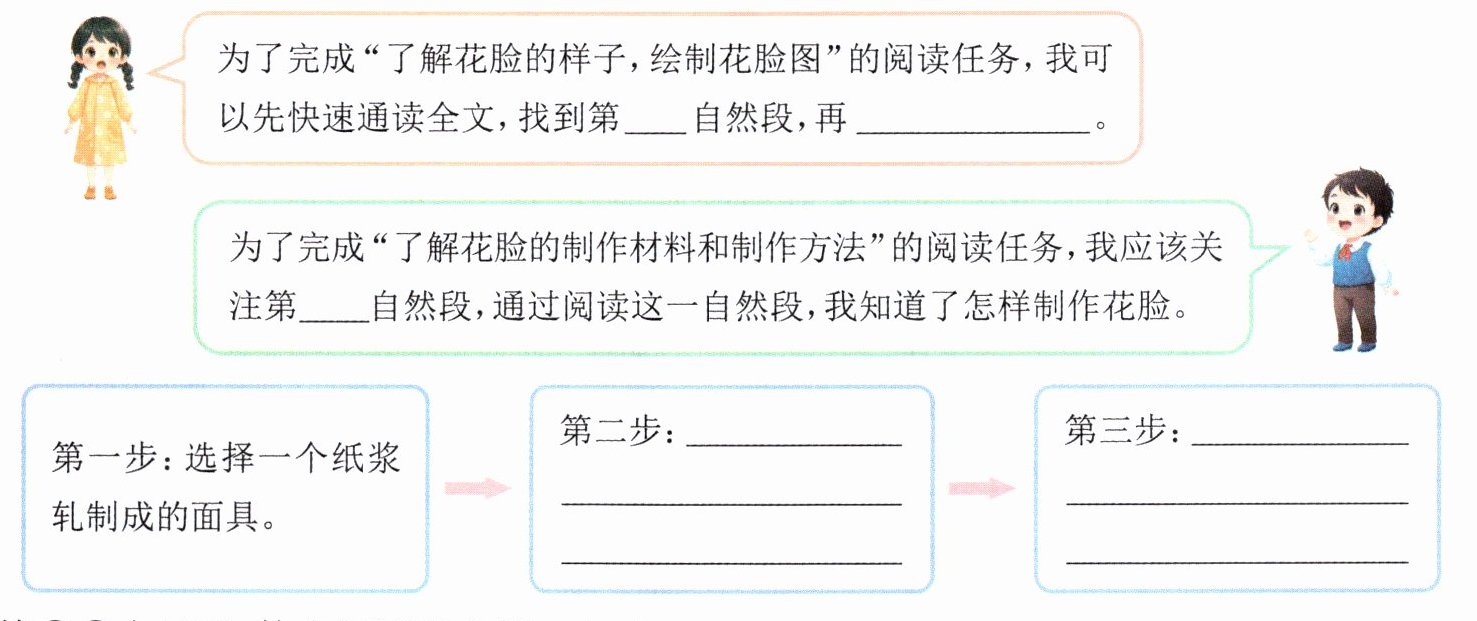 为了完成了“了解花脸的样子,绘制花脸图”的阅读任务,我可以先快速通读全文,找到第 ___ 自然段,再 ___ 。