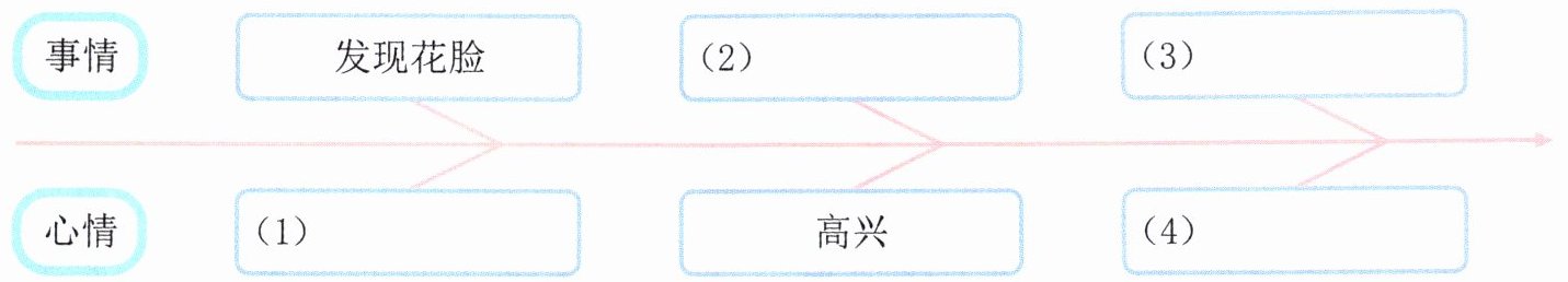 1. 思维导图 短文围绕“我”和花脸写了三部分的内容,表现了“我”不同的心情。请认真阅读全文,完成下面的思维导图。(4 分)