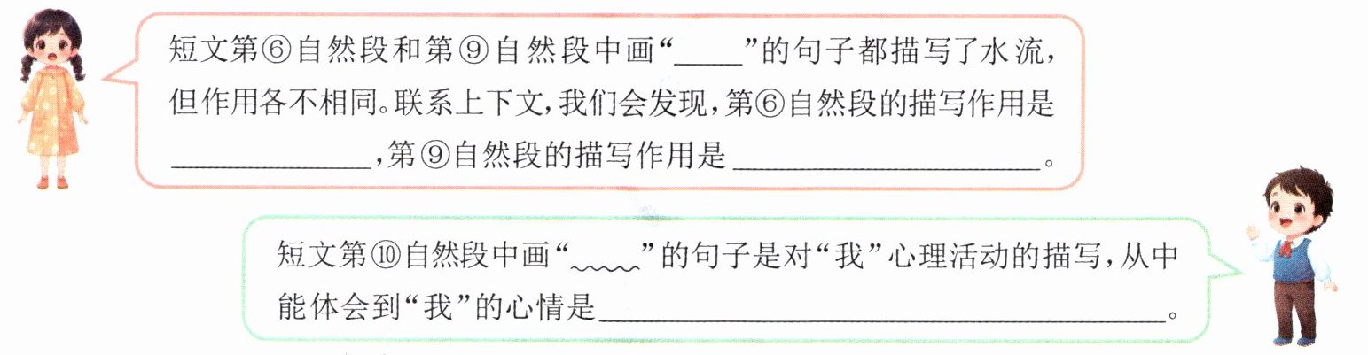短文第⑥自然段和第⑨自然段中画“____”的句子都描写了水流,但作用各不相同。联系上下文,我们会发现,第⑥自然段的描写作用是______,第⑨自然段的描写作用是______。