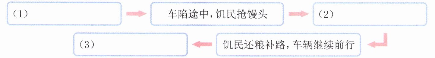 ③ 卡车在公路上疯狂地弹跳着向前冲去。不该发生的事发生了,第一辆卡车陷进炮弹坑里,熄火了。押车官兵全部下了车,跑去搬石头填炮弹坑、推车,累得气喘吁吁。就在这时候,聚来不少瘦得皮包骨的饥民,怯生生地围着卡车转。不知是谁喊了一声:“车里有馒头!”顿时,饥民们一拥而上,钻进车厢抢馒头!