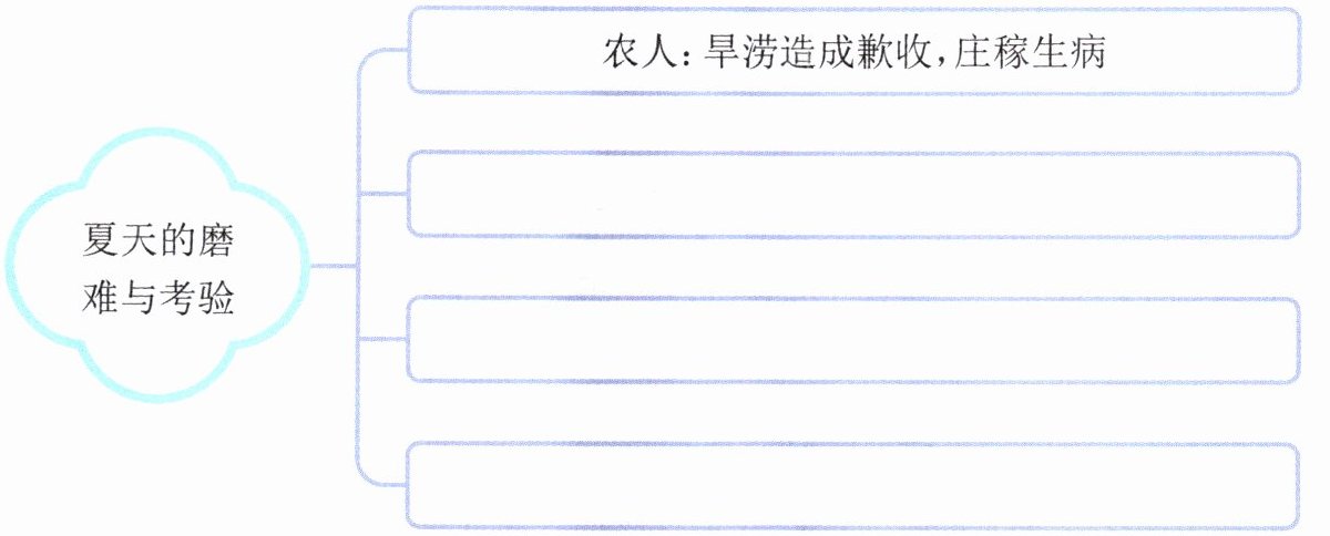 2. 阅读要素 思考短文第②自然段是怎样围绕“夏天的磨难跟考验”这个中心来展开叙述的,并完成下面的思维导图。(3 分)