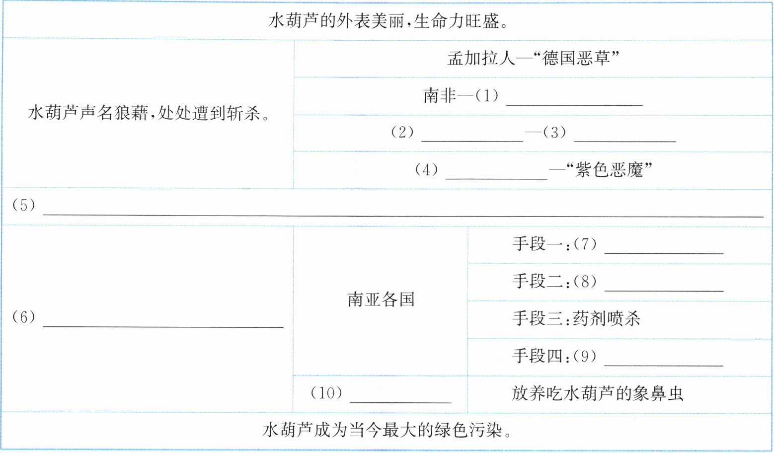 2. 阅读要素 本文是围绕水葫芦的哪几个方面来写的呢?请梳理短文内容,完成下面的表格。(10 分)