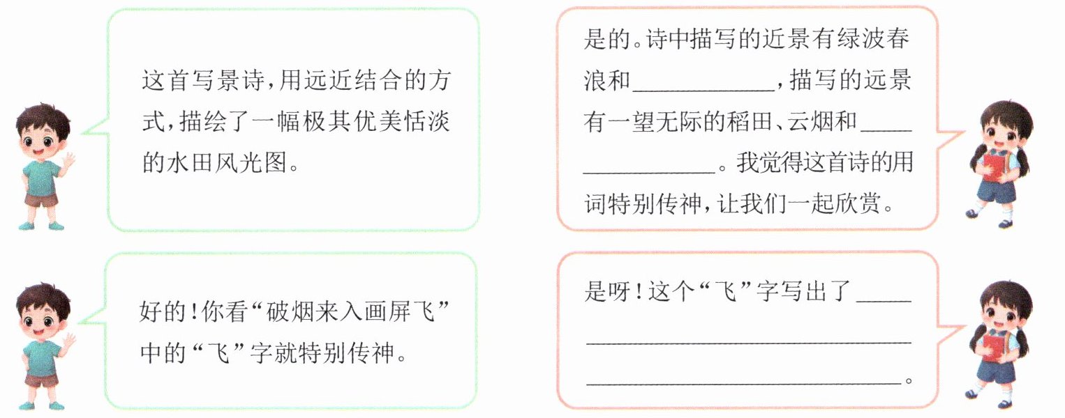 是的。诗中描写的近景有绿波春浪和______,描写的远景有一望无际的稻田、云烟和______。我觉得这首诗的用词特别传神,让我们一起欣赏。