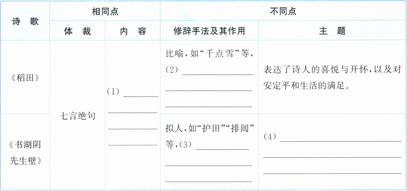 2. 链接教材 将《稻田》与王安石的《书湖阴先生壁》进行对比阅读,完成下面的表格。(4 分)