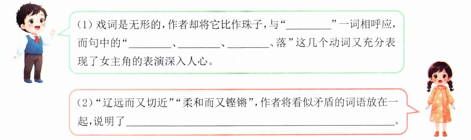 2. (1)圆润(1 分) 滚(1 分) 滴(1 分) 溅(1 分) (2)女主角的唱腔极富变化(1 分) 解析:(1)本题考查理解能力。因为珠子是圆的,因此与“圆润”相呼应,句子中的“滚、滴、溅、落”都是珠子的动态特征,且能体现表演的深入人心。(2)本题考查对关键词的理解能力。“辽远”与“切近”、“柔和”与“铿锵”互为反义词,用在这里表现女主角的唱腔极富变化,突出了梅兰芳的表演技艺精湛。