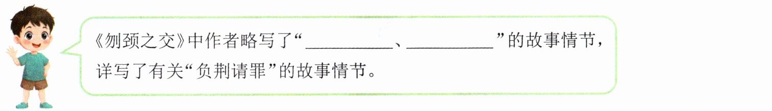 3.《刎颈之交》中作者略写了“完璧归赵、渑池会面”的故事情节,详写了有关“负荆请罪”的故事情节。在《刎颈之交》中,门客们与蔺相如对话时,门客们表达的观点是“我们为您做事,是因为敬仰您是个真正崇高的君子”“可现在您居然对狂妄的廉颇忍气吞声,我们可受不了”;蔺相如表达的观点是“我连秦王都不怕,又怎么会怕廉颇呢”“秦国现在不敢来犯,只是慑于我和廉颇一文一武保护着赵国”“我又怎能因小小的私人恩怨而不顾江山社稷呢”。通过他们的对话,你觉得蔺相如最值得你敬佩的是以国家利益为重,顾全大局。