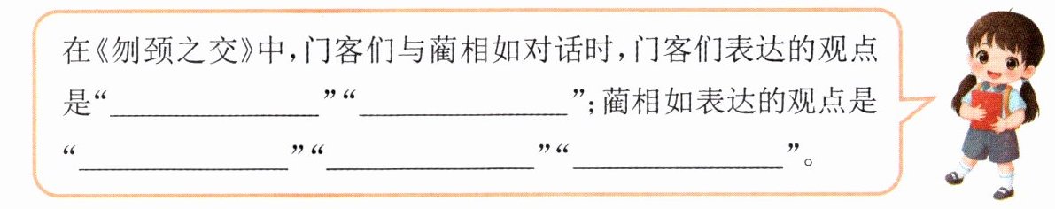 在《刎颈之交》中,门客们与蔺相如对话时,门客们表达的观点是“______”“______”;蔺相如表达的观点是“______”“______”“______”。