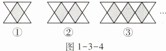 解 由图1-3-3可知,第①个图案用了4+5= 9(根)木棍,第②个图案用了4+5×2= 14(根)木棍,第③个图案用了4+5×3= 19(根)木棍,……,∴第ⓝ个图案用了(4+5n)根木棍,∴第⑧个图案用了4+5×8= 44(根)木棍。