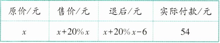 在此基础上,再退还给顾客$6$元现金,所以顾客实际只需花$x + 20\%x - 6$元。