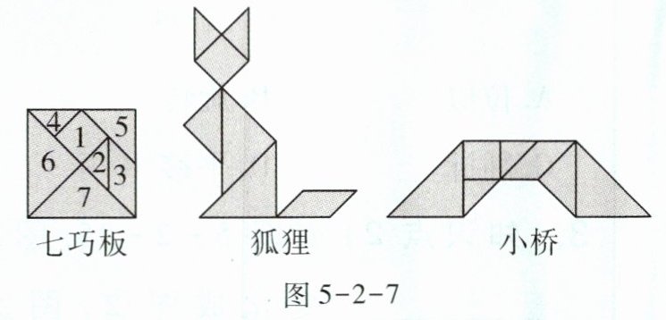 (2)用七巧板可以拼出许多图形,如图5-2-7所示的狐狸和小桥,你知道它们各部分是由七巧板中的哪一块图形构成的吗?在图中标出来。