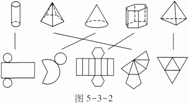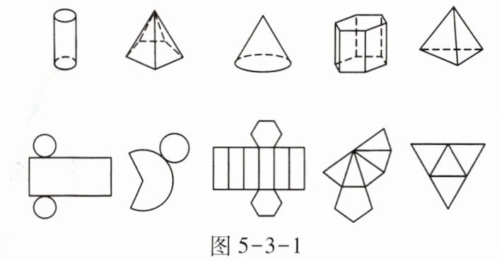 解:如图所示,将图5-3-1中的几何体与平面展开图对应连线如下: