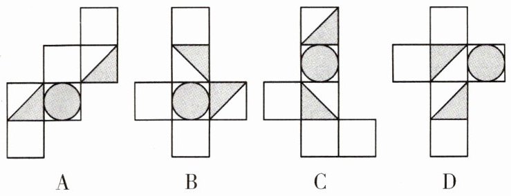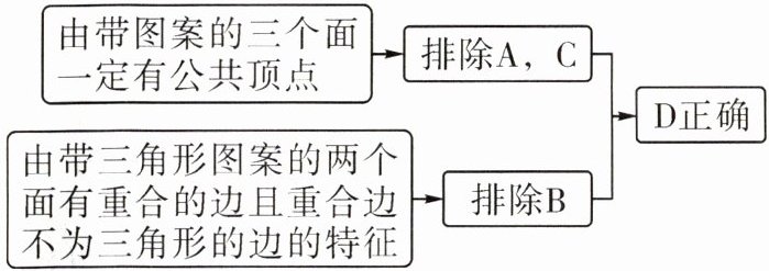 解:由带图案的三个面一定有公共顶点,排除A,C;由带三角形图案的两个面有重合的边且重合边不为三角形的边的特征,排除B,故D正确。