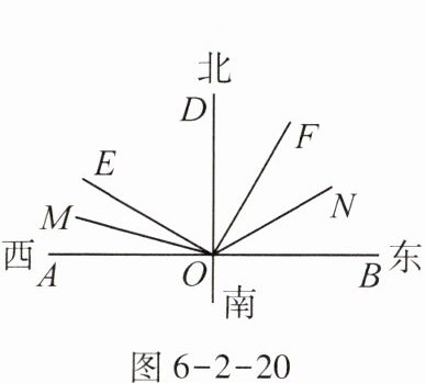 6.(知识点1,6·能力点4)如图6-2-20,按照上北下南,左西右东的规定画出方向十字线,$\angle AOE= m^{\circ }$,$\angle EOF= 90^{\circ }$,OM,ON分别平分$\angle AOE和\angle BOF$,下面说法:①点E位于点O北偏西$m^{\circ }$的方向上;②点F位于点O北偏东$m^{\circ }$的方向上;③$\angle MON= 135^{\circ }$,其中正确的有( )。