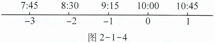 解 本例中的时间是60进制,却要用10进制的正数、负数表示,转化比较复杂,极易混淆出现错误,利用数形结合法用直线上的点表示时间及与之对应的数,“以形助数”可巧妙、直观地解决问题。如图2-1-4,可知上午7:45应记为-3。