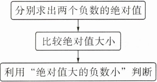 分别求出两个负数的绝对值→比较绝对值大小→利用"绝对值大的负数小"判断