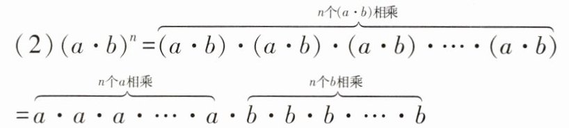 (2)$(a\cdot b)^{n}= \underset{n个(a\cdot b)相乘}{\underbrace{(a\cdot b)\cdot(a\cdot b)\cdot(a\cdot b)…\cdot(a\cdot b)}}= \underset{n个a相乘}{\underbrace{a\cdot a\cdot a…\cdot a}}\cdot\underset{n个b相乘}{\underbrace{b\cdot b\cdot b…\cdot b}}= a^{n}\cdot b^{n}$。