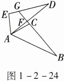 7. (能力点2,3)如图1-2-24,△ABC≌△ADE,BC的延长线分别交AD,DE于点F,G,且∠DAC= 10°,∠B= ∠D= 25°,∠EAB= 120°,求∠DFB和∠DGB的度数。