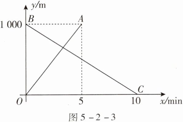 一条笔直的路上依次有M,P,N三地,其中M,N两地相距1000 m。甲、乙两机器人分别从M,N两地同时出发,去目的地N,M,匀速而行。如图5-2-3中OA,BC分别表示甲、乙机器人离M地的距离$y(m)与行走时间x(min)$的函数关系图像。