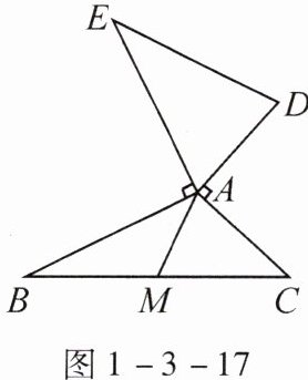 如图1-3-17,AB= AE,AB⊥AE,AD= AC,AD⊥AC,点M为BC的中点,求证:DE= 2AM。