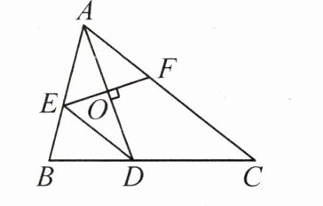 证明:因为 AD 是∠BAC 的平分线,所以∠BAD=∠CAD。因为 AD 的垂直平分线交 AB 于点 E,交 AC 于点 F,所以 AE=ED,∠AOE=∠AOF=90°。在△AOE 和△AOF 中,{∠EAO=∠FAO,AO=AO,∠AOE=∠AOF,所以△AOE≌△AOF(ASA),所以 AE=AF。又因为 AE=ED,所以 AF=ED。