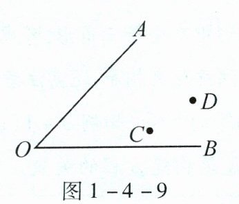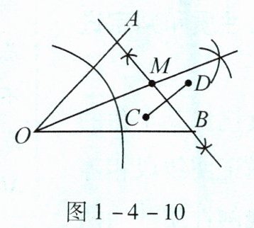 如图1-4-9,在"V"形公路($∠AOB$)内部有两个村庄C和D,现要建一个果品加工厂M,使其到"V"形公路的距离相等,且使C,D两村的工人上下班的路程一样,用尺规在图上作出果品加工厂M的位置。(保留作图痕迹)
