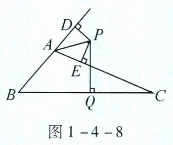 如图1-4-8,$∠DAC$的平分线交BC边的垂直平分线于点P,$PD⊥AB$,垂足为D。(1)过点P作$PE⊥AC$,垂足为E,求证:$BD= CE$;(2)若$AB= 6cm,AC= 10cm$,求AD的长。