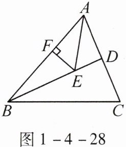 6.(能力点4)如图1-4-28,AE是$∠BAC$的平分线,BD是△ABC中AC边的中线,AE,BD相交于点E,$EF⊥AB$,垂足为F,若$AB= 14,AC= 12,S_{△BDC}= 20$,则EF的长为______。