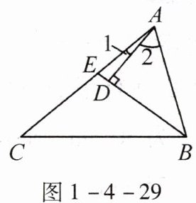 7.(能力点4)如图1-4-29,在△ABC中,BE是$∠ABC$的平分线,$AD⊥BE$,垂足为D。求证:$∠2= ∠1+∠C$。