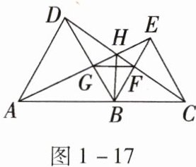如图1-17,在直线AC的同一侧作等边三角形ABD和等边三角形BCE,连接AE与CD交于点H。