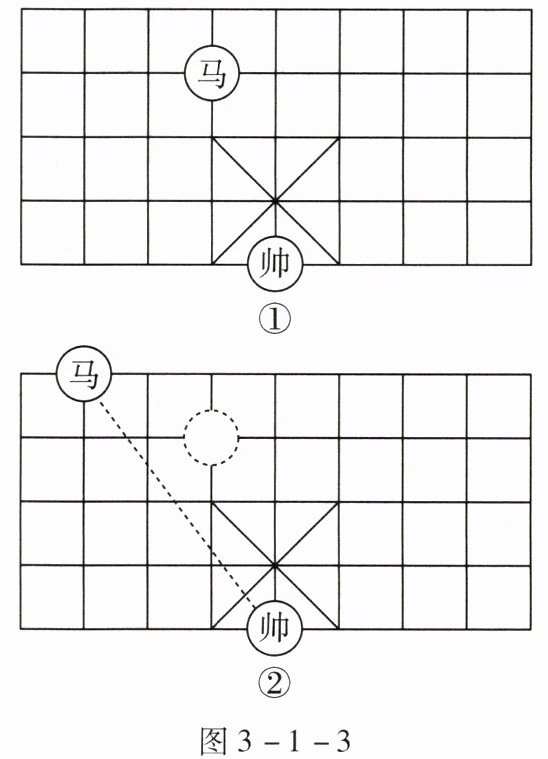 解:以“帅”的位置为原点建立平面直角坐标系,设每个小正方形边长为1。由图①可知“帅”的坐标为(0,0),“马”的初始坐标为(0,3)。