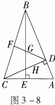 如图3-8,在△ABC中,∠ABC= 45°,CD⊥AB,BE⊥AC,垂足分别为D,E,F为BC中点,BE与DF,DC分别交于点G,H,∠ABE= ∠CBE。