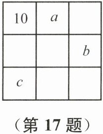 17. (2024泰州姜堰期中)夏禹时代的“河图洛书”被视为中华文明之源.河图主要代表天文,洛书则主要代表地理方位.其中,“洛书”所呈现的数字排列方式,与三阶幻方有相似之处,其实际数学意义就是它每行、每列、每条对角线上三个数之和均相等,则如图所示的幻方中常数a,b,c满足的等量关系为______.