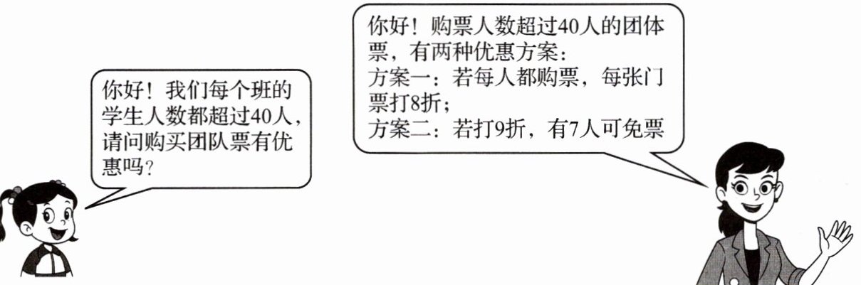 3 (2025南京浦口月考)七年级准备组织学生到某社会实践基地参加社会实践活动,门票价为每人20元,由各班班长负责买票.下面是1班班长与售票员咨询的对话: