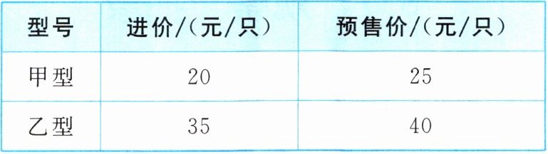 9 (2024南京鼓楼期末)某商店购进甲、乙两种型号的节能灯共100只,购进100只节能灯的进货价恰好为2600元,这两种节能灯的进价、预售价如表:(利润= 售价-进价)