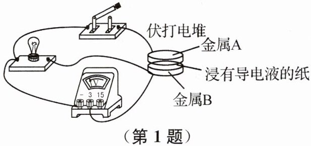 1(2024南通海门月考)小明自制“伏打电堆”并连接了如图所示电路.闭合开关,小灯泡发光,电压表指针右偏,下列说法正确的是(