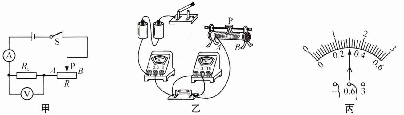 (4)正确连接电路闭合开关后,电压表示数为2.7 V时,电流表如图丙所示,电流表示数为______A,则此时测得$R_{x}$的阻值是______Ω.