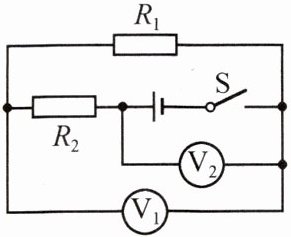 例1 如图所示电路中,$R_1= 15\ \Omega$,$R_2= 30\ \Omega$,闭合开关S,电压表V_1与V_2的示数之比是(