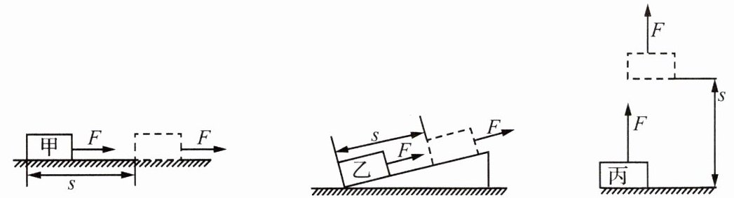 例2 现有甲、乙、丙三个质量不同的物体($m_甲>m_乙>m_丙$),在相等的恒力F作用下,分别在水平方向、沿斜面向上、竖直方向通过了相等的距离s,如图所示.F在三种情况下做的功分别为$W_甲、W_乙、W_丙$,三者大小判断正确的是(