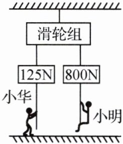 9 (2025 苏州吴江模拟)如图所示,小华用一滑轮组匀速拉起较重的小明.小华手中绳子向下移动4 m,小明上升 0.5 m,左右两侧测力计示数分别为 125 N 和 800 N,求: