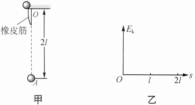 10 提素养 原长为 l 的橡皮筋一端固定在 O 点,另一端悬挂一个小钢球,将钢球从 O 点释放,钢球运动到 A 点后开始向上返回,O、A 两点间距离为 2l,如图甲所示. 请在图乙中画出钢球从 O 点运动到 A 点的过程中,其动能随运动距离变化的大致关系图像.